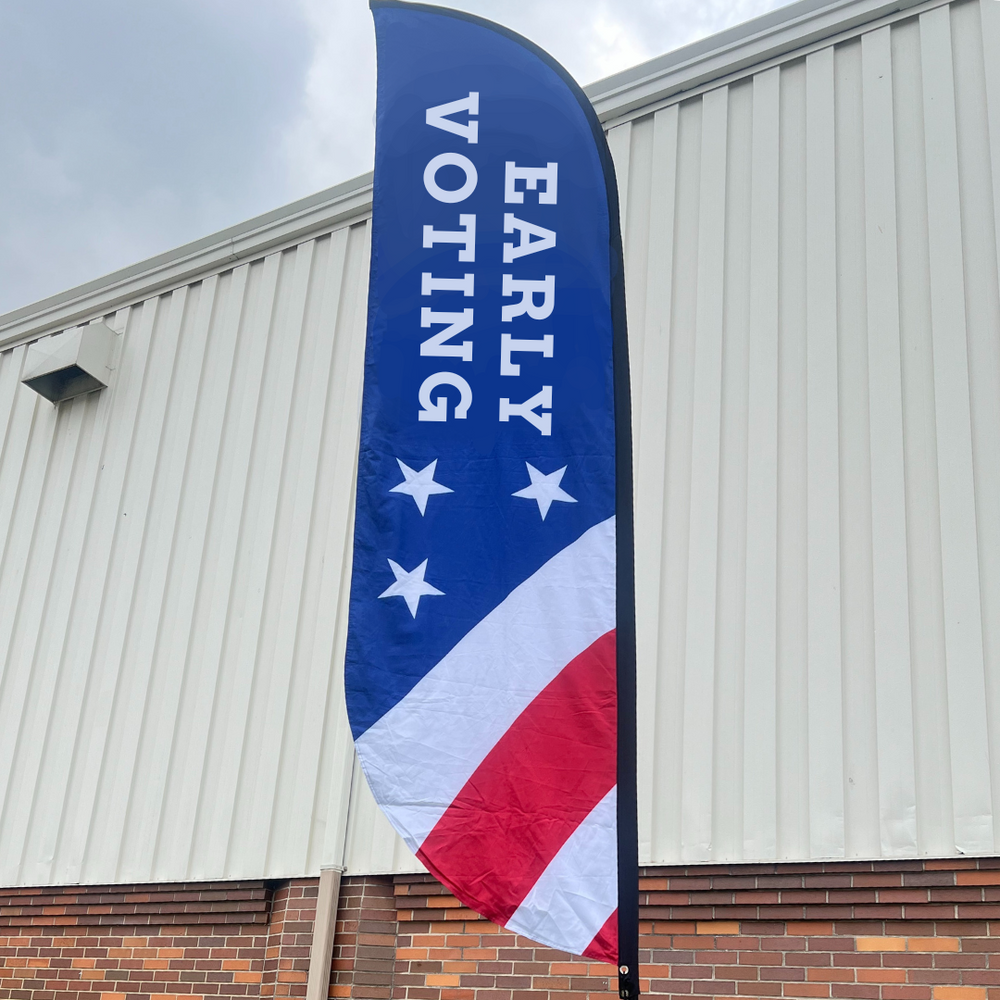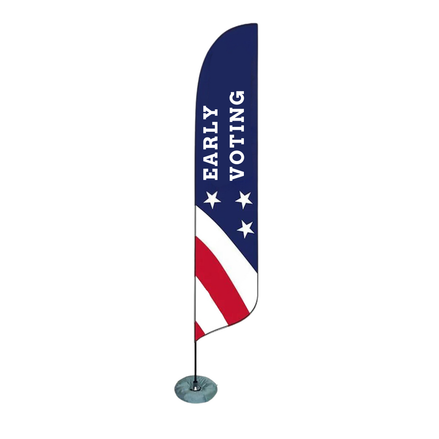 Vote aquí signo de la pluma. Forma y movimiento llamativos que captan tu atención. La tela para banderas duradera y resistente a la intemperie de 10 'de altura con fácil montaje hace que esta pancarta sea ideal para cualquier lugar de votación. Impreso en ambos lados con soporte de superficie dura, estaca para el suelo, bolsa de almacenamiento y el peso del tubo de agua incluidos. Artículo SG-Feather