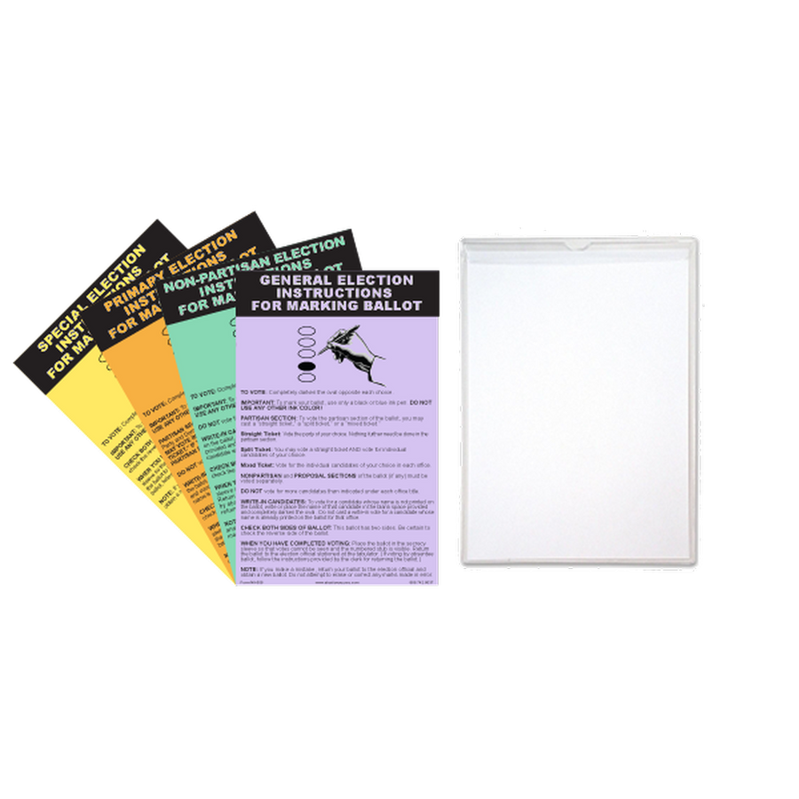 El kit de instrucciones de marcado de boleta ovalada le permite adaptar sus fundas de confidencialidad actuales para cumplir con los requisitos de la nueva ley. El kit incluye un bolsillo de vinilo adhesivo en la parte posterior de 5 1/2 "X 8 1/2" y 1 juego de 4 instrucciones para marcar las papeletas en papel grueso de color NO PARTIDARIO para cada estilo de elección. MI-505