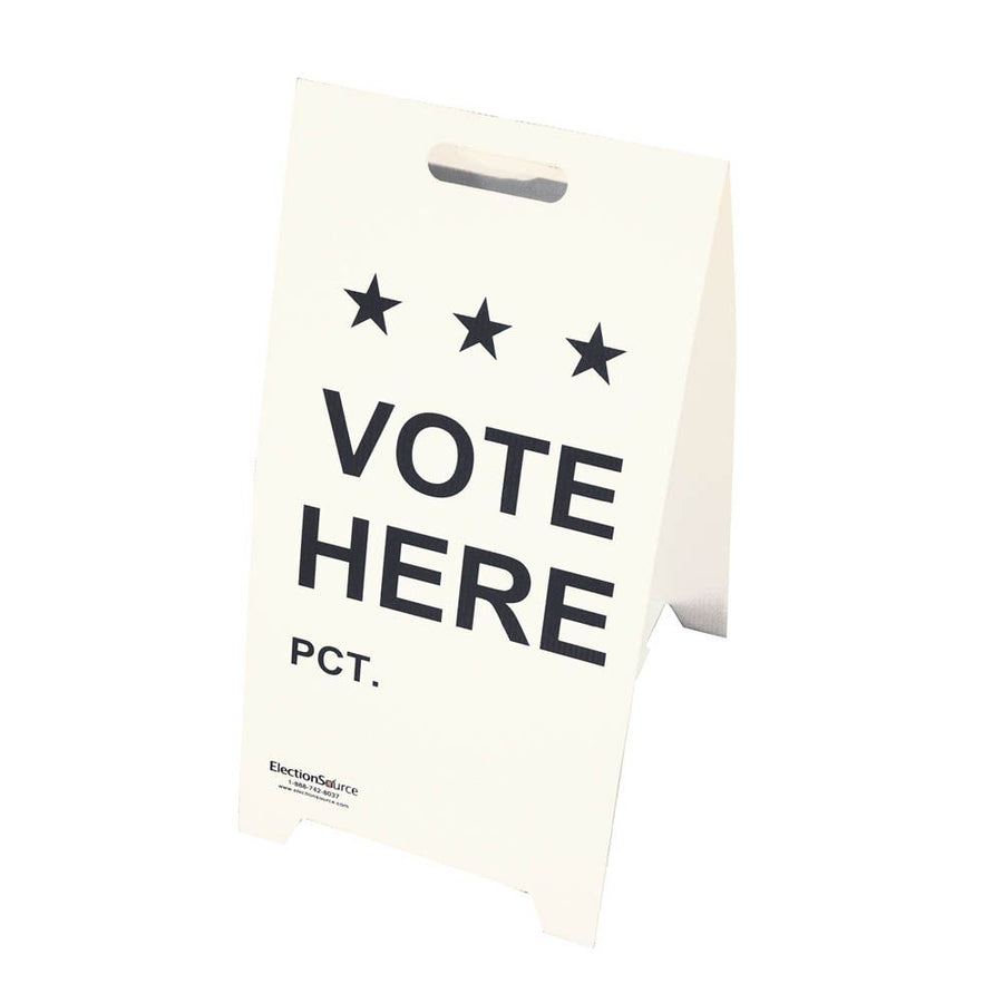 "Vote aquí" con el letrero de designación de distrito. La imagen y el texto están preimpresos en ambos lados del A-Frame. Hecho de plástico corrugado y resistente a la oxidación. El tamaño total es de 15 "de ancho x 30" de alto. Solo impresión azul. SG-152