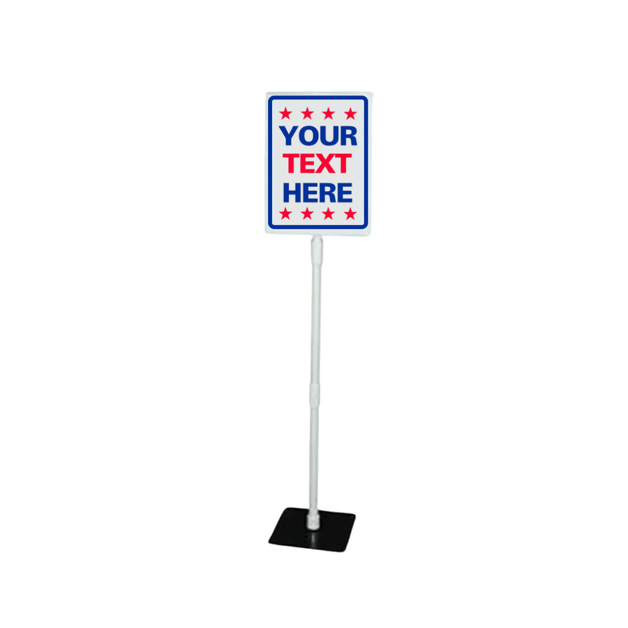 Panel frontal de 9 1/2 "de ancho x 11" de alto hecho de plástico de poliestireno. Esta señal se puede colocar en 3 alturas diferentes; 16 ", 28 1/2" o 41 "utilizando las extensiones provistas, ya sea de una vez o por sí mismas. El letrero y todas las extensiones provistas encajan fácilmente en la base de 7" x 7 "que se encuentra en la parte superior de una mesa. SG -701J