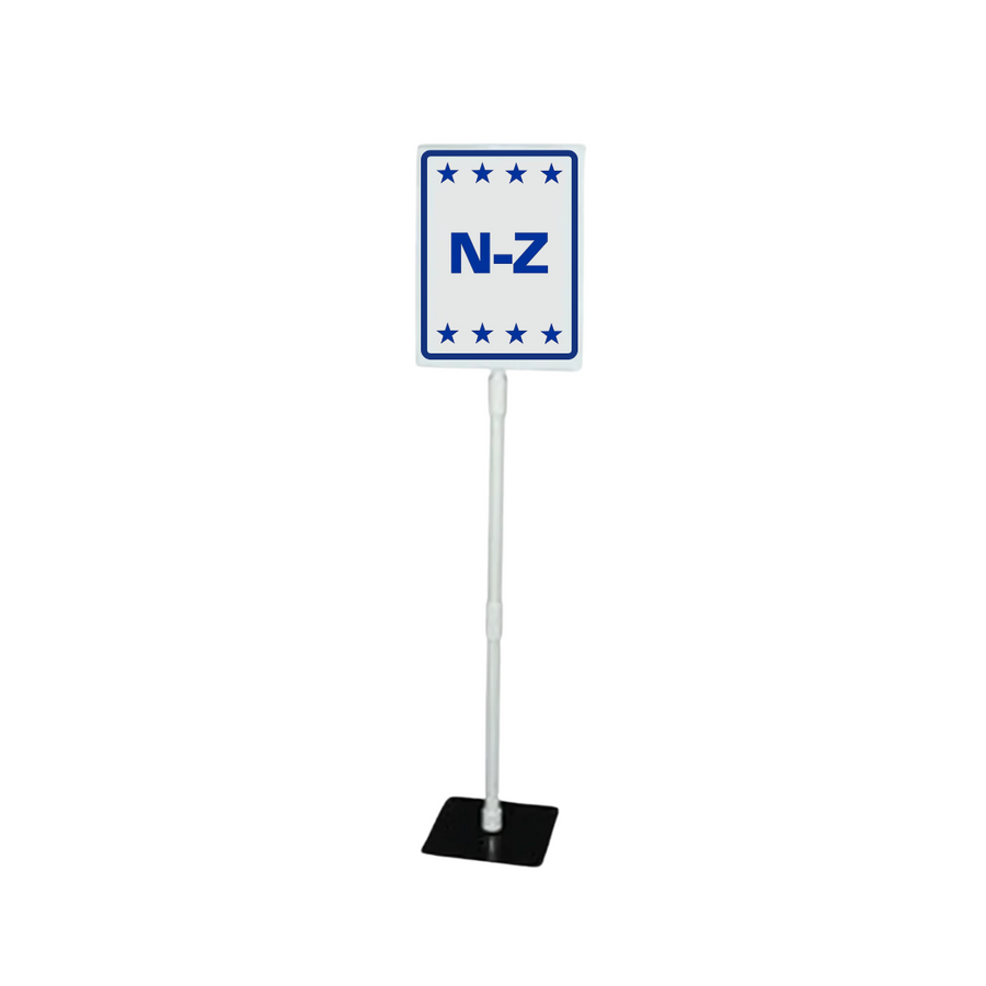 Panel frontal de 9 1/2 "de ancho x 11" de alto hecho de plástico de poliestireno. Esta señal se puede colocar en 3 alturas diferentes; 16 ", 28 1/2" o 41 "utilizando las extensiones provistas, ya sea de una vez o por sí mismas. El letrero y todas las extensiones provistas encajan fácilmente en la base de 7" x 7 "que se encuentra en la parte superior de una mesa. SG -310J