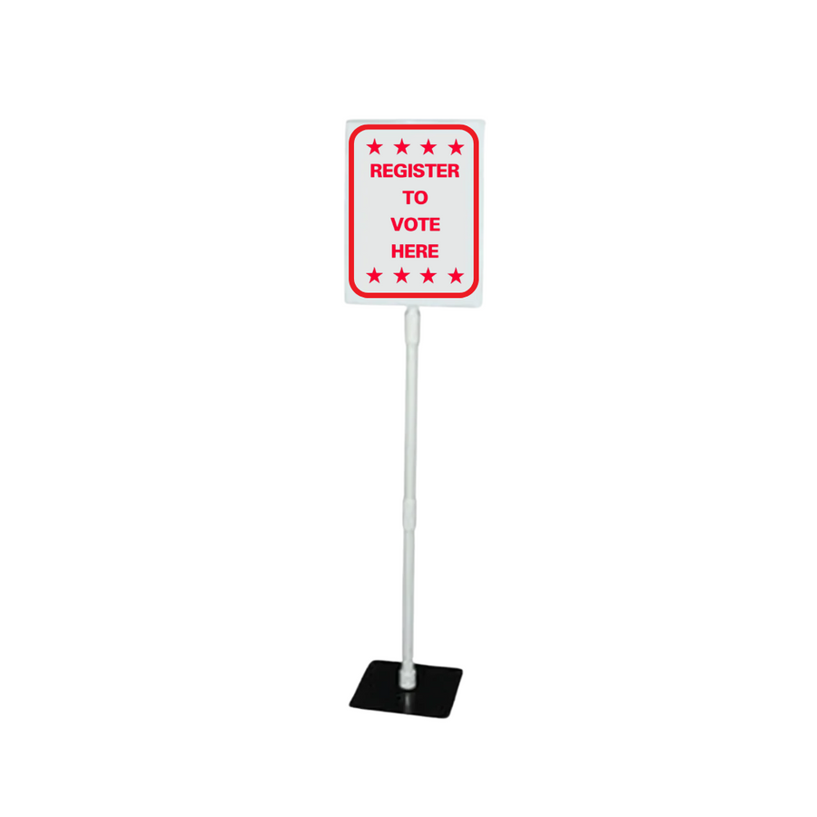 Panel frontal de 9 1/2 "de ancho x 11" de alto hecho de plástico de poliestireno. Esta señal se puede colocar en 3 alturas diferentes; 16 ", 28 1/2" o 41 "utilizando las extensiones provistas, ya sea de una vez o por sí mismas. El letrero y todas las extensiones provistas encajan fácilmente en la base de 7" x 7 "que se encuentra en la parte superior de una mesa. SG -211J