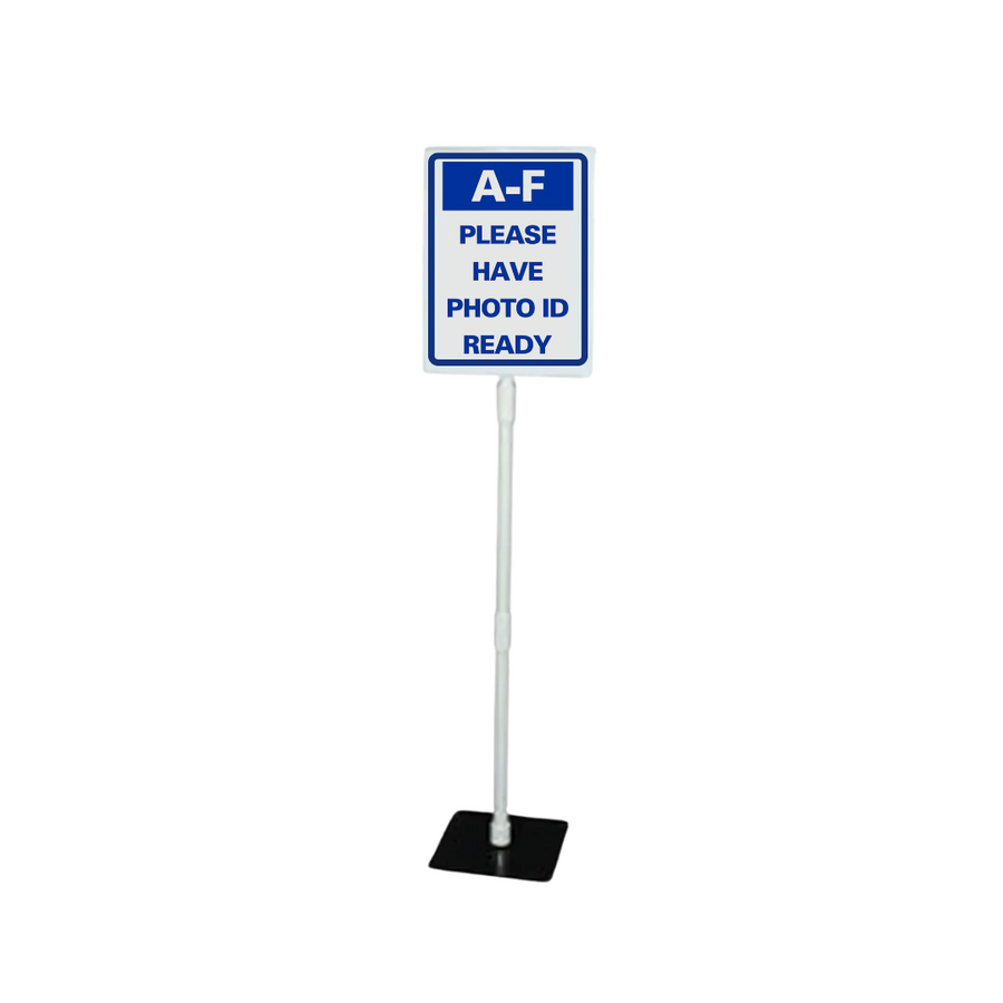 Panel frontal de 9 1/2 "de ancho x 11" de alto hecho de plástico de poliestireno. Esta señal se puede colocar en 3 alturas diferentes; 16 ", 28 1/2" o 41 "utilizando las extensiones provistas, ya sea de una vez o por sí mismas. El letrero y todas las extensiones provistas encajan fácilmente en la base de 7" x 7 "que se encuentra en la parte superior de una mesa. SG -318J