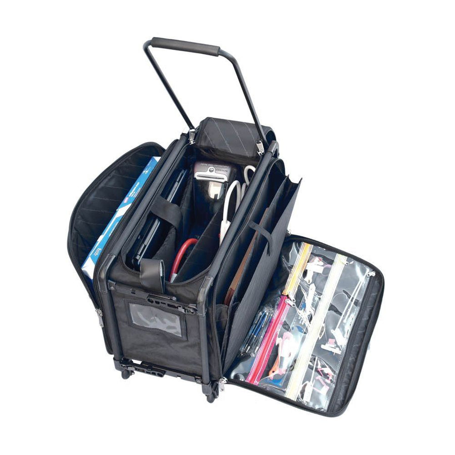 La bolsa de suministros TUTTO de 4 ruedas tiene organizadores codificados por colores, bolsa acolchada para libros electrónicos, 3 ventanas de identificación, candado HASP y bandejas de papeleo. ¡Apila 150 libras y se pliega a 3 "! Dimensiones 22" L x 15 "H x 12" D Artículo # BA-113