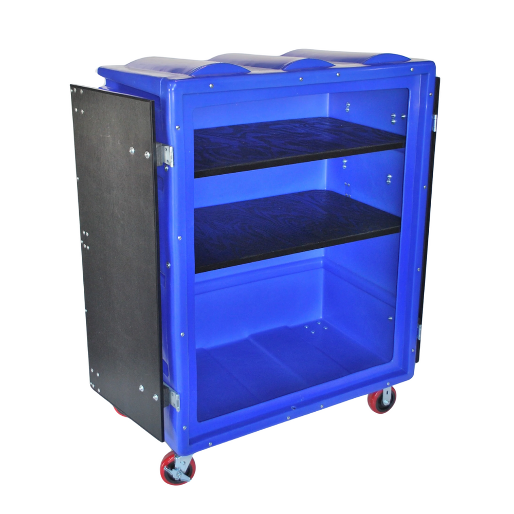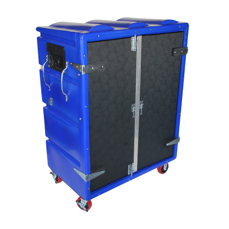 Carro electoral grande con puertas con cerradura, dos estantes, ruedas de 6 ", manijas de agarre de 13" y bolsa para documentos. Capacidad de peso de 950 lb. peso del carro 140 lbs. Dimensiones exteriores 58 "L x 29" W 67 "H. Volumen interno 46 pies cúbicos. CT-RTC-5829H6