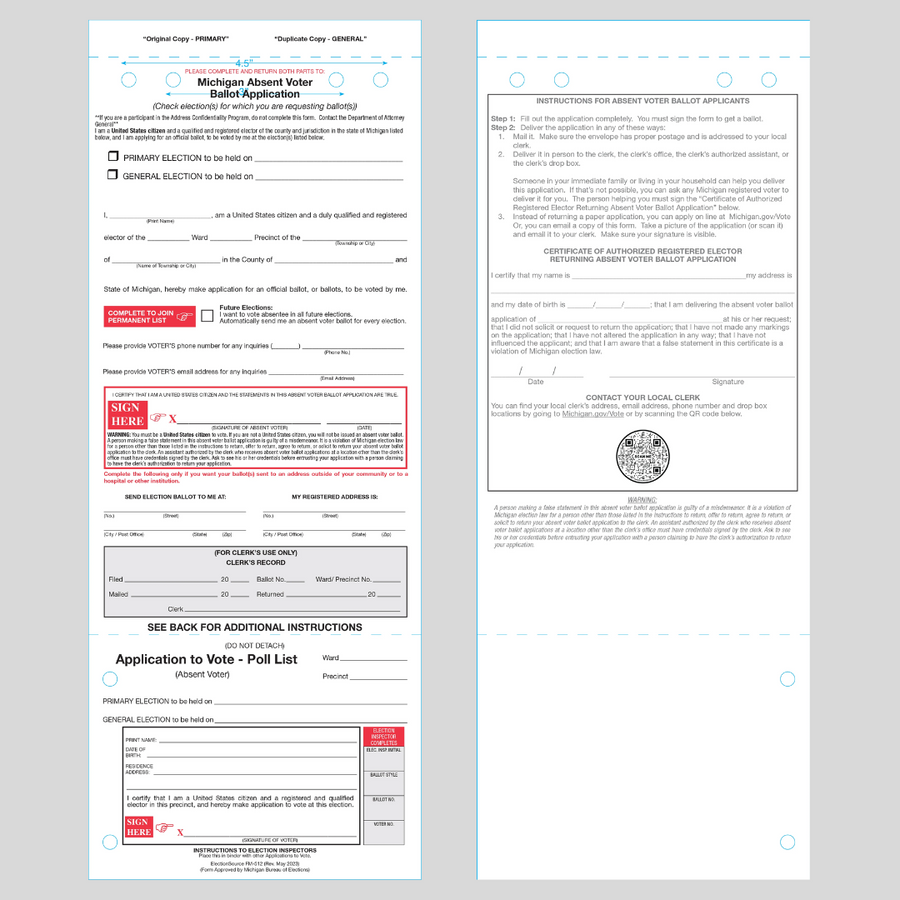 Features: This is a two-part form for primary and general elections. Instructions are printed on the back of each application. The form is 15'' long and 5 1/2'' wide. The bottom portion of the form has perforation for easy removal and two pre-punched holes.