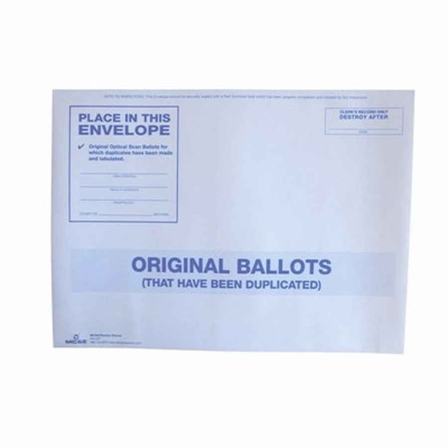 Features: Original Ballots (that have been duplicated), white envelope with blue print on front, printed instructions on what to place in the envelope, how to seal, and when to destroy. The envelope expands up to 2'' and features an easy peel-and-stick flap. Overall size is 15'' long and 11'' tall.